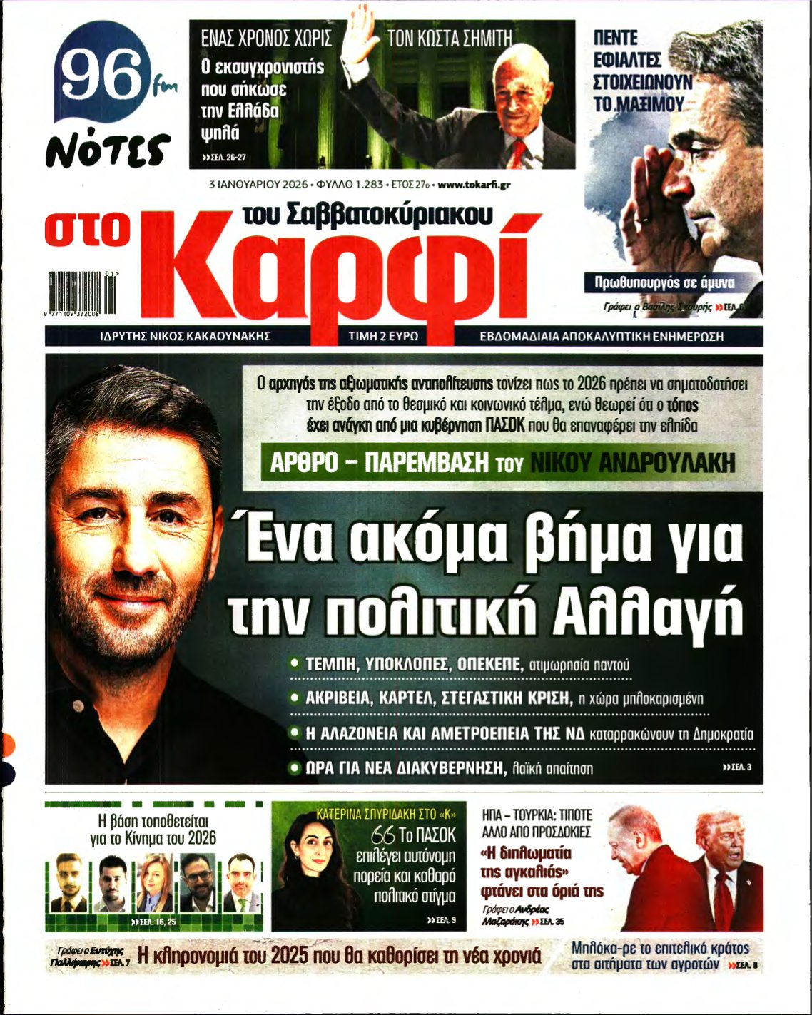 Σε αχαρτογράφητα νερά το πολιτικό σκηνικό το 2026 την Κυριακή θα κριθεί η αποκλιμάκωση ή η σύγκρουση με τα μπλόκα τα τρία μεγάλα αγκάθια του αγροτικού ΝΔ vs ΚΚΕ, Βελόπουλος, Ζωή, Νατσιός εδώ ανασχηματισμός, εκεί ανασχηματισμός που είναι ο ανασχηματισμός; Στυλιανίδης, Χατζηδάκης, Γεραπετρίτης τα ονόματα που συζητιούνται