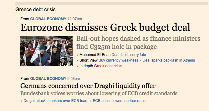 Χαρακτηριστικός το τίτλος του Reuters: «Η Ελλάδα αποτυγχάνει να πείσει, η Ευρώπη ζητάει περισσότερα» γράφει και συνεχίζει: «Η Ευρωπαϊκή Ένωση και το ΔΝΤ έχουν εξοργιστεί από μια σειρά ανεκπλήρωτων υποσχέσεων και εβδομάδες διαβουλεύσεων για τα μέτρα».