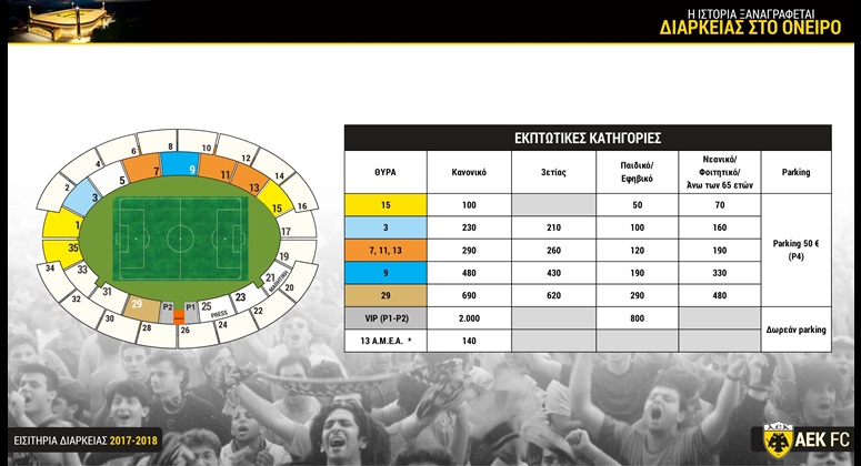 Για την αγορά του εισιτηρίου διαρκείας της σεζόν 2017-18 είναι υποχρεωτική η αγορά της κάρτας φίλου της ερασιτεχνικής ΑΕΚ έναντι 10 ευρώ!