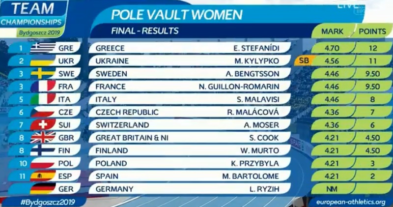 Όταν ο πήχης τοποθετήθηκε στα 4.70μ. και η Στεφανίδη έκανε άκυρο το πρώτο της άλμα, είχε ήδη εξασφαλίσει τη νίκη και τους 12 βαθμούς για τη χώρα μας. Η Ελληνίδα πρωταθλήτρια προσπέρασε αυτό το ύψος με την τρίτη, ενώ “κόλλησε” στα 4.80μ. αν και στις δύο τελευταίες της προσπάθειες έδειξε ικανή να ξεπεράσει τον πήχη.