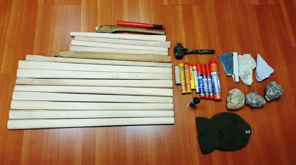 Κατά τη διάρκεια των ελέγχων βρέθηκαν -επιμελώς κρυμμένα- σε ένα από τα λεωφορεία: Δεκαέξι ξύλινα στειλιάρια, 8 φωτοβολίδες, 1 κροτίδα, 1 σπρέι πιπεριού, 1 σφυρί, 1 κουκούλα, καθώς και μάρμαρα και πέτρες.