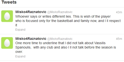 Μέσω twitter απάντησε στα σενάρια που ήθελαν τον Βασίλη Σπανούλη να έχει συζητήσει με διάφορες ομάδες, ο μάνατζέρ του, Μίσκο Ραζνάτοβιτς.