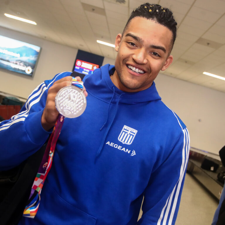 Ο Εμμανουήλ Καραλής “μόστραρε” το μετάλλιό του από το παγκόσμιο πρωτάθλημα κλειστού στίβου στην επιστροφή της ελληνικής αποστολής από την Κίνα και δήλωσε ότι μπορεί να είναι ασημένιο, αλλά για τον ίδιο είναι σαν χρυσό.