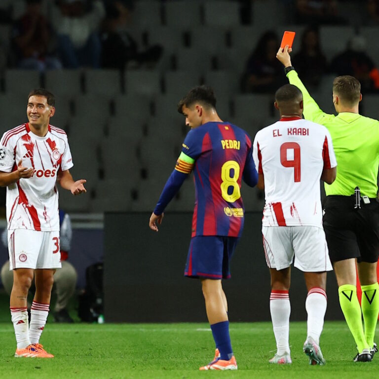 Ο Σαντιάγο Έσε αποβλήθηκε με δεύτερη κίτρινη κάρτα για φάουλ στον Κασάδο της Μπαρτσελόνα, με τον διαιτητή να δίνει ένα σφύριγμα που εξοργίζει τους ανθρώπους του Ολυμπιακού.