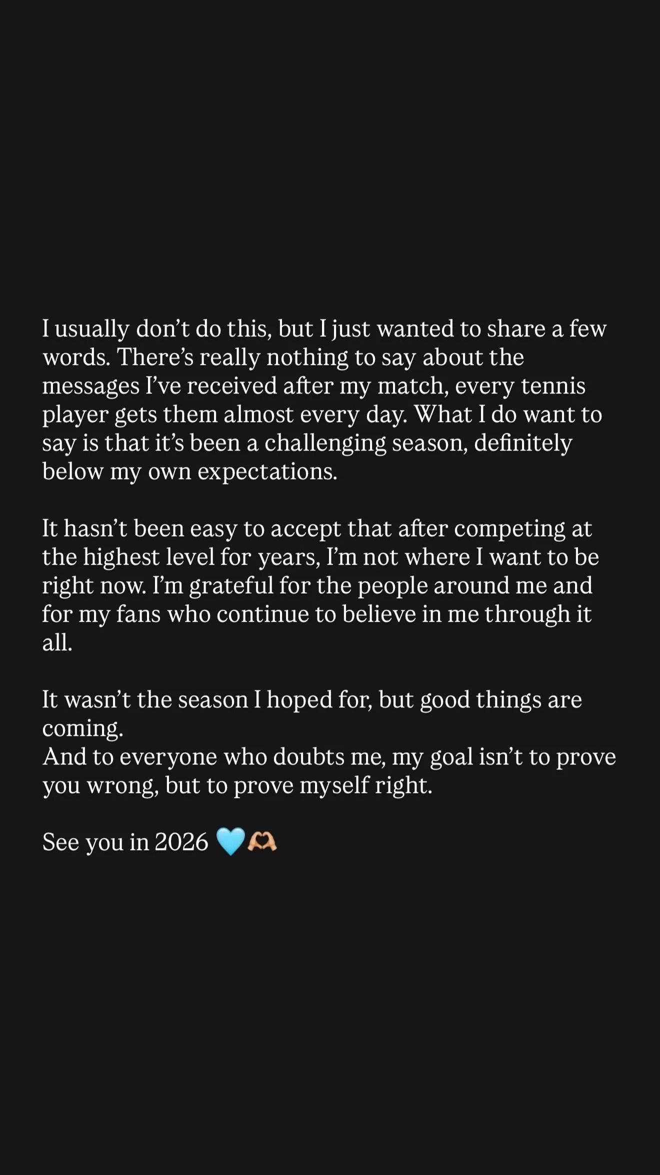 “Συνήθως δεν το κάνω αυτό, αλλά ήθελα απλώς να μοιραστώ μερικά λόγια. Δεν υπάρχει πραγματικά κάτι να πω για τα μηνύματα που έλαβα μετά τον αγώνα μου — κάθε τενίστρια τα λαμβάνει σχεδόν κάθε μέρα. Αυτό που θέλω να πω είναι ότι ήταν μια δύσκολη σεζόν, σίγουρα κάτω από τις δικές μου προσδοκίες.