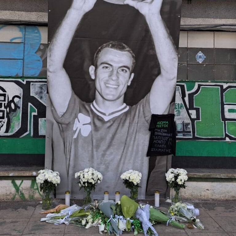 “Αιώνια πιστός. Μια ζωή Παναθηναϊκός. Παππού θα σ’ αγαπώ για πάντα, Σταμάτης” είναι το μήνυμα που αναγράφεται πάω στην μπλούζα που άφησε ο εγγονός του “στρατηγού” στο μπάνερ που έχει τοποθετηθεί στο “Απ. Νικολαΐδης” από το Σάββατο (25.01.2025).