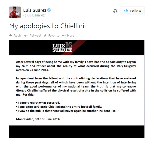 Ο Λουίς Σουάρες ζήτησε δημόσια συγνώμη από τον Τζιόρτζιο Κιελίνι, για το δάγκωμα που του έδωσε, ενώ τόνισε πως δεν πρόκειται να υποπέσει άλλη φορά σε ανάλογο περιστατικό