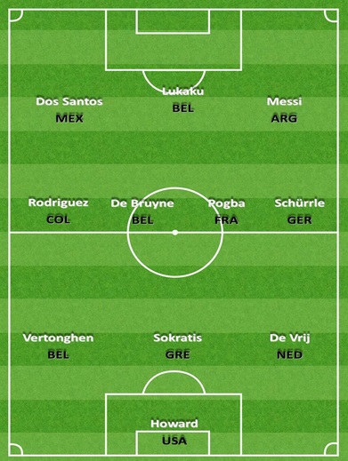 Χάουαρντ (ΗΠΑ), Ντε Φράι (Ολλανδία), Βερτόνχεν (Βέλγιο), Παπασταθόπουλος (Ελλάδα), Σίρλε (Γερμανία), Πογκμπά (Γαλλία), Ντε Μπρούιν (Βέλγιο), Ροντρίγκες (Κολομβία), Ντος Σάντος (Μεξικό), Λουκάκου (Βέλγιο), Μέσι (Αργεντινή).