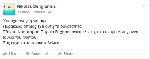 Στο ποστ του στο Facebook ο Νίκος Δεληγιάννης ενημερώνει σχετικά με την ανάγκη για αίμα για όσους έχουν τη διάθεση να βοηθήσουν.