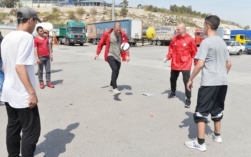 Φορτούνης, Μιλιβόγεβιτς, Καπίνο, Μπουχαλάκης, Μαζουάκου, Κασάμι και Καμπιάσο βρέθηκαν στο λιμάνι με τους δύο τελευταίους μάλιστα να παίζουν και μπάλα με δύο πρόσφυγες.