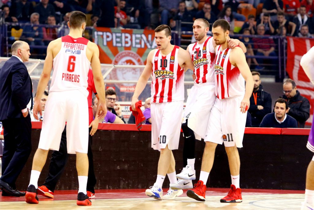 Ο παίκτης του Ολυμπιακού δεν μπορούσε καν να πατήσει το πόδι του κάτω και τον σήκωσαν αγκαλιά οι συμπαίκτες του για να τον πάνε στο ιατρείο.