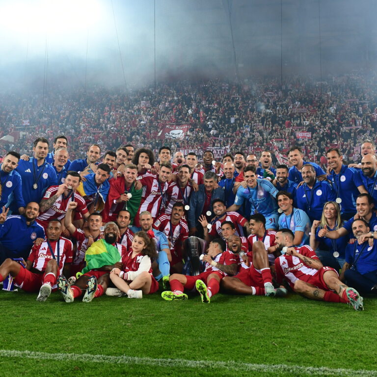 Ολυμπιακός: Η πανηγυρική φωτογραφία των πρωταθλητών Ελλάδας με το τρόπαιο της Super League, μπροστά στη Θύρα 7