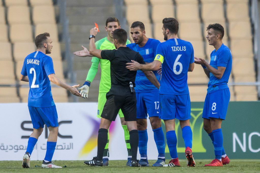 Η πρώτη μεγάλη φάση για τη Γαλανόλευκη χάθηκε στο 33′. Η τρομερή εκτέλεση φάουλ του Μπακασέτα από τα 34 μέτρα έστειλε τη μπάλα στην αριστερή δοκό του Σαουδάραβα κίπερ! Πέρα από αυτή την ευκαιρία, η ομάδα του Σκίμπε δεν παρουσίασε κάτι αξιόλογο. Μάλιστα, στο 43′ ο Γιαννούλης ανέτρεψε αντίπαλο -τη στιγμή που προσπαθούσε να μπει στη μεγάλη περιοχή του Μπάρκα- με τον διαιτητή να τον αποβάλει με κόκκινη κάρτα. Η απόφαση ήταν λανθασμένη, παρόλα αυτά ο Έλληνας αμυντικός έγινε ο πρώτος παίκτης στην ιστορία της Εθνικής Ελλάδας, που αποβάλλεται στο ντεμπούτο του!