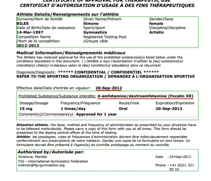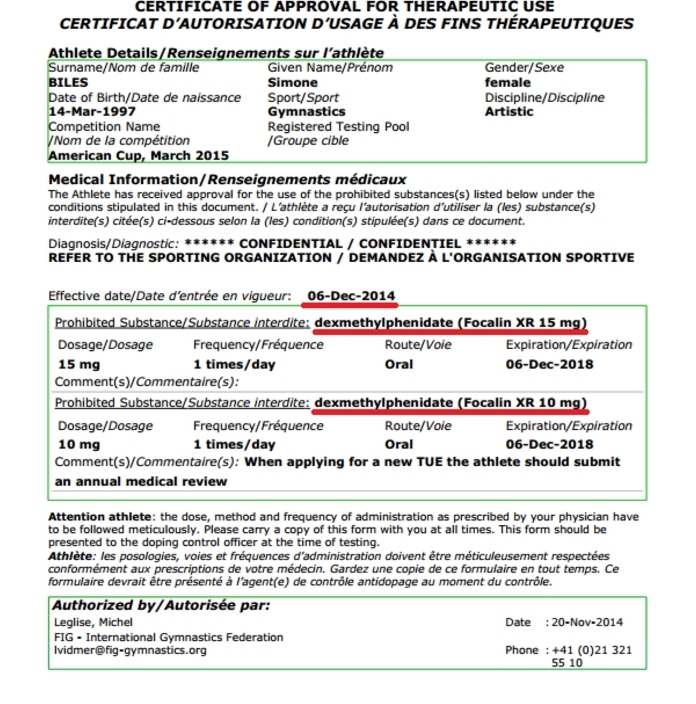 Ωστόσο, προκαλεί απορία το γεγονός ότι η Μπάιλς το 2014 ζήτησε την τελευταία άδεια για τη χρήση της ουσίας και την εξασφάλισε ως το 2018. Φαίνεται ότι ζητά σχετική άδεια από το 2012, τον Σεπτέμβριο. Οντως υπάρχουν περιπτώσεις -ειδικά παιδιών- που κάνουν μακροχρόνια χρήση της μεθυλφαινιδάτης, η οποία είναι αμφεταμίνη. Πρόκειται για εξαρτησιογόνα ουσία και δίδεται επίσης σε όσους επιθυμούν να “κόψουν” την κοκαΐνη. Λειτουργεί δηλαδή όπως η μεθαδόνη για την αντίστοιχη διακοπή της ηρωΐνης.