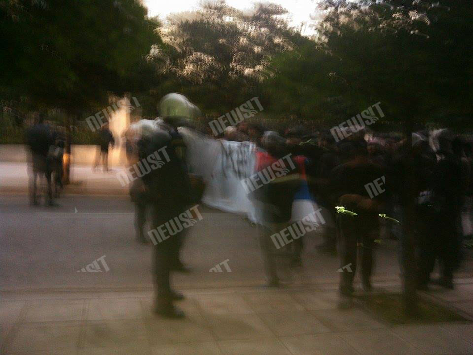 Μια διμοιρία των ΜΑΤ που βρίσκεται στην συμβολή της Βασιλίσσης Σοφίας με την Ηρώδου Αττικού κινήθηκε γρήγορα και εμπόδισε τους διαδηλωτές να φτάσουν έξω από το Μέγαρο Μαξίμου.