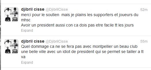 “Κρίμα που δεν θα γίνει η μετεγγραφή στην Μονπελιέ. Σπουδαία ομάδα, σπουδαία πόλη, αλλά είναι ηλίθιος ο πρόεδρος και προσβάλλει τους πάντες”, ήταν το πρώτο tweet του Σισε και συνέχισε: