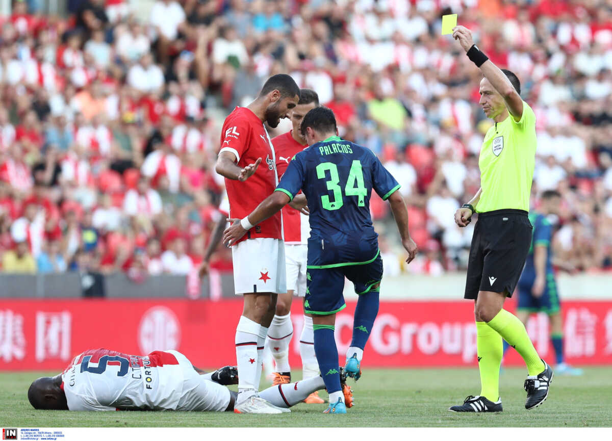 Ο Παναθηναϊκός έμεινε με δέκα παίκτες στο 40ο λεπτό του αγώνα με τη Σλάβια Πράγας στην Τσεχία, για τον τρίτο προκριματικό του Conference League.