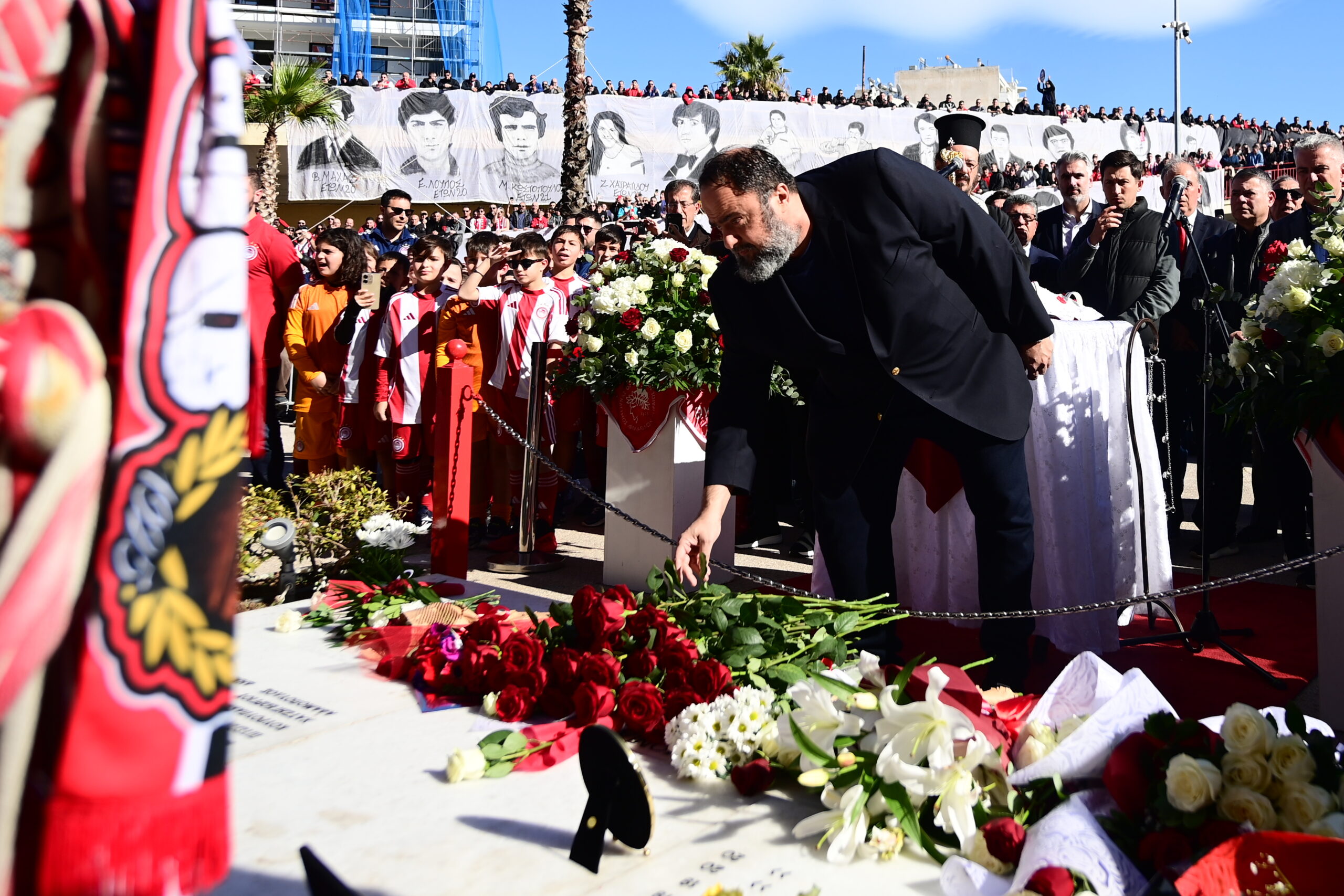 Ο Βαγγέλης Μαρινάκης ήταν εκεί μαζί με όλη την ποδοσφαιρική ομάδα του Ολυμπιακού για να αφήσουν από ένα λουλούδι για τις 21 ψυχές που χάθηκαν άδικα πριν 45 χρόνια.