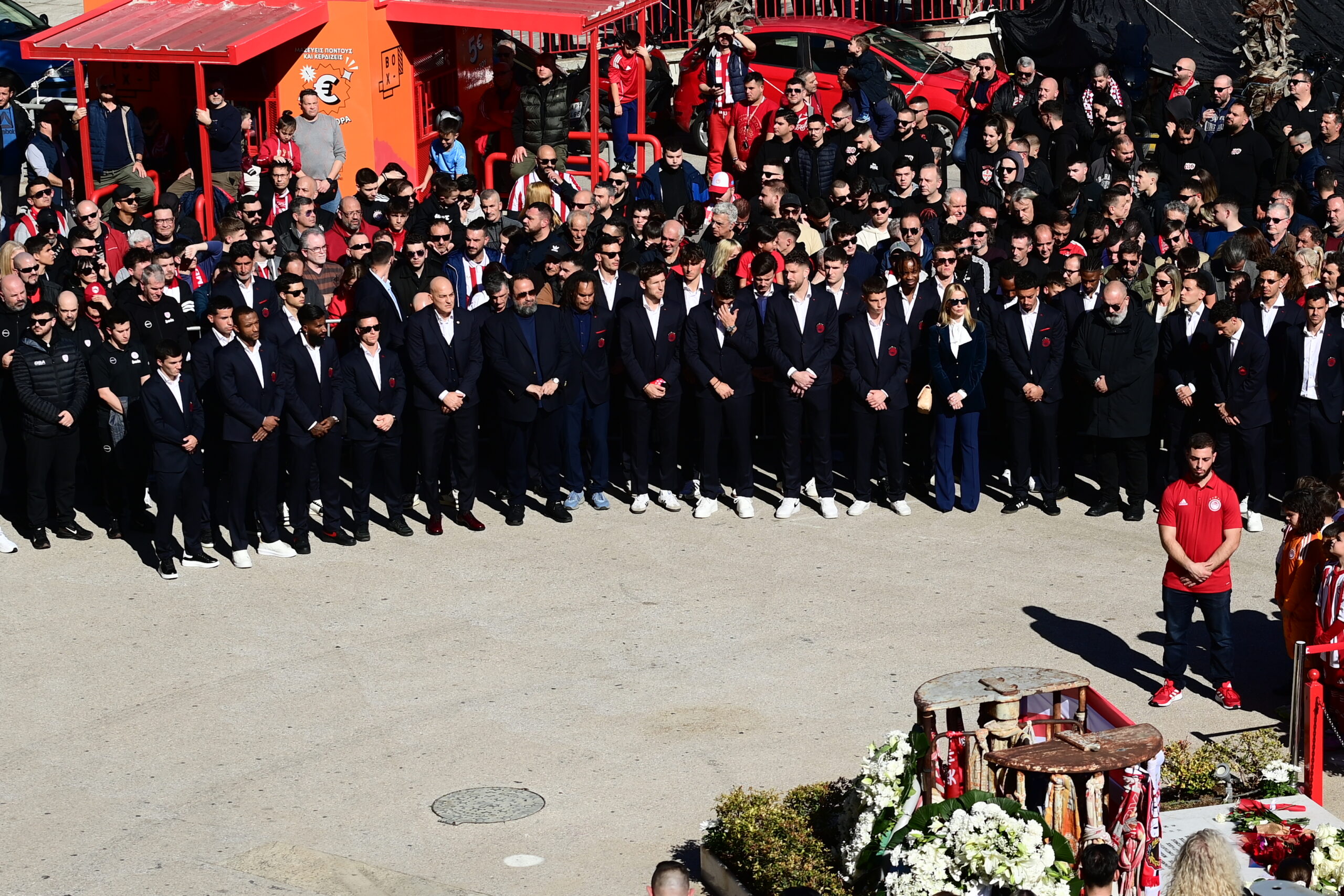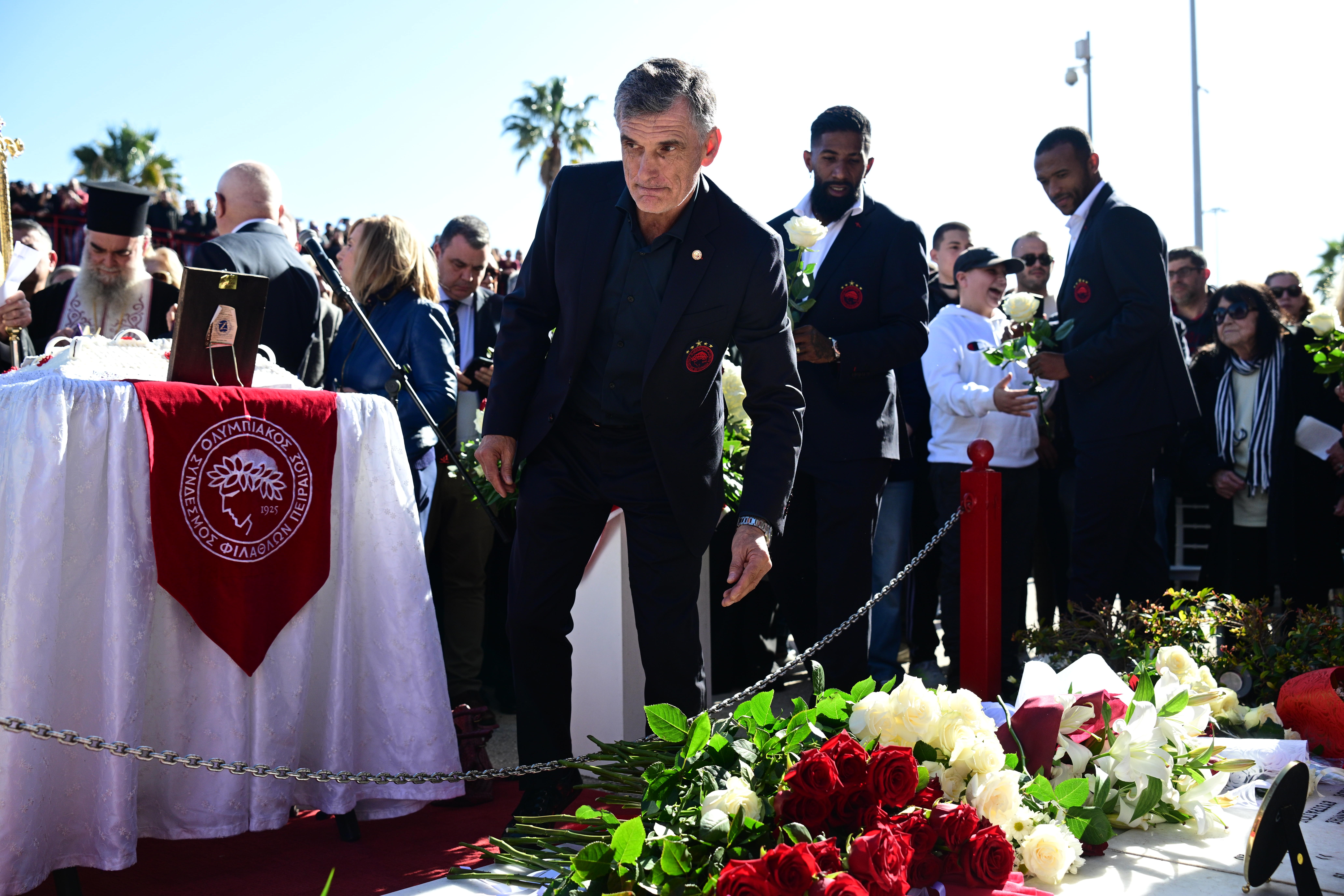 Ο Γιώργος Μπαρτζώκας και οι παίκτες του μπασκετικού Ολυμπιακού τίμησαν και αυτοί με την παρουσία τους, τους οπαδούς της ομάδας, αφήνοντας από ένα λουλούδι.