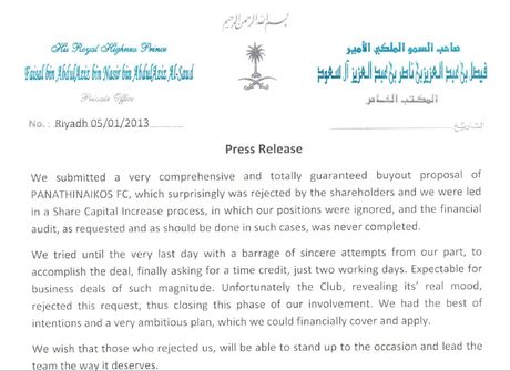 Καταθέσαμε μια πολύ κατανοητή και απολύτως εγγυημένη πρόταση αγοράς της ΠΑΕ Παναθηναϊκός, η οποία προς έκπληξή μας απορρίφθηκε από τους μετόχους και οδηγηθήκαμε σε μια διαδικασία ΑΜΚ, στην οποία οι θέσεις μας αγνοήθηκαν και ο οικονομικός έλεγχος, όπως ζητήθηκε και όπως πρέπει να γίνεται σε αυτές τις περιπτώσεις, δεν ολοκληρώθηκε ποτέ.