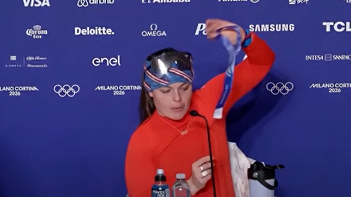 Η Μπρίζι Τζόνσον, συγκεκριμένα, η οποία κέρδισε το το χρυσό στην κατάβαση του αλπικού σκι γυναικών, έδειξε το χαλασμένο μετάλλιό της στη συνέντευξη Τύπου.