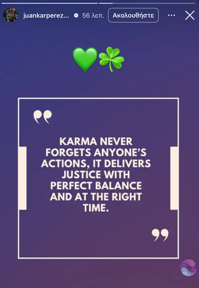 «Το κάρμα ποτέ δεν ξεχνά τις πράξεις του καθενός και αποδίδει δικαιοσύνη με τέλεια ισορροπία και την κατάλληλη στιγμή», έγραψε στο Instagram ο Χουάνκαρ.