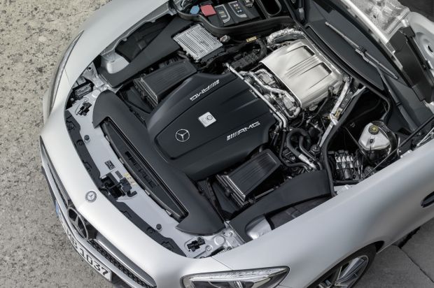 Όπως αναφέραμε και πιο πριν, η νέα Mercedes-AMG GT προσφέρεται σε απλή και S έκδοση. Και οι δύο εκδόσεις εφοδιάζονται με τον καινούριο 4λιτρο V8 Biturbo που συνδυάζεται με 7άρι ημιαυτόματο κιβώτιο διπλού συμπλέκτη. Στην απλή έκδοση αποδίδει 462 ίππους και 61,2 kgm ροπής και επιταχύνει την βάρους 1.540 kg AMG GT από στάση στα 100 km/h σε 4,0 sec. Η τελική ταχύτητα της απλής έκδοσης περιορίζεται ηλεκτρονικά στα 304 km/h.