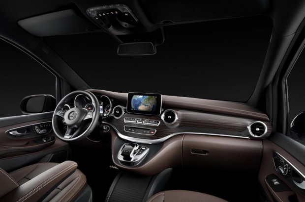 Ομοίως αναβαθμισμένη εικόνα συναντάς και στην καμπίνα, καθώς το V-Class είναι ντυμένο με δέρμα πολύ καλής ποιότητας, ενώ υπάρχουν ξύλινες διακοσμήσεις και ξεχωριστά πίσω καθίσματα που χωρίζονται από μια κεντρική κονσόλα. Άλλα αξιοπαρατήρητα σημεία είναι ο κρυφός φωτισμός της καμπίνας, οι μεταλλικές διακοσμήσεις και η οθόνη πολυμέσων και λειτουργιών COMAND.