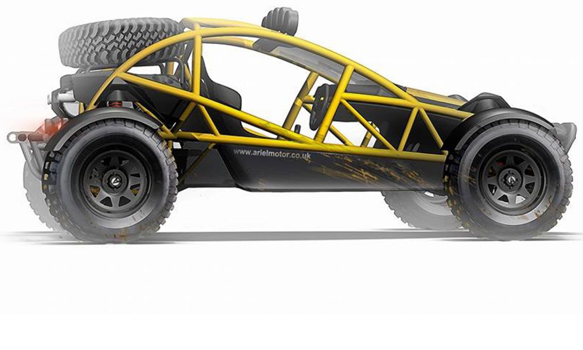 To απόλυτο 4×4 της Ariel ζυγίζει επίσης κάτω από 800 kg και διαθέτει το ίδιο μινιμαλιστικό στιλ και το σωληνωτό πλαίσιο με το Atom. Διαθέτει επιπλέον όμως, μεγάλα τρακτερωτά λάστιχα, ενισχύσεις αμαξώματος, μια μεγάλη σιδεριά για εμπρός προφυλακτήρα και ένα στιβαρό ρολ κέιτζ. Παραδόξως και ανησυχητικά, η κίνηση μεταδίδεται μόνο στους πίσω τροχούς!