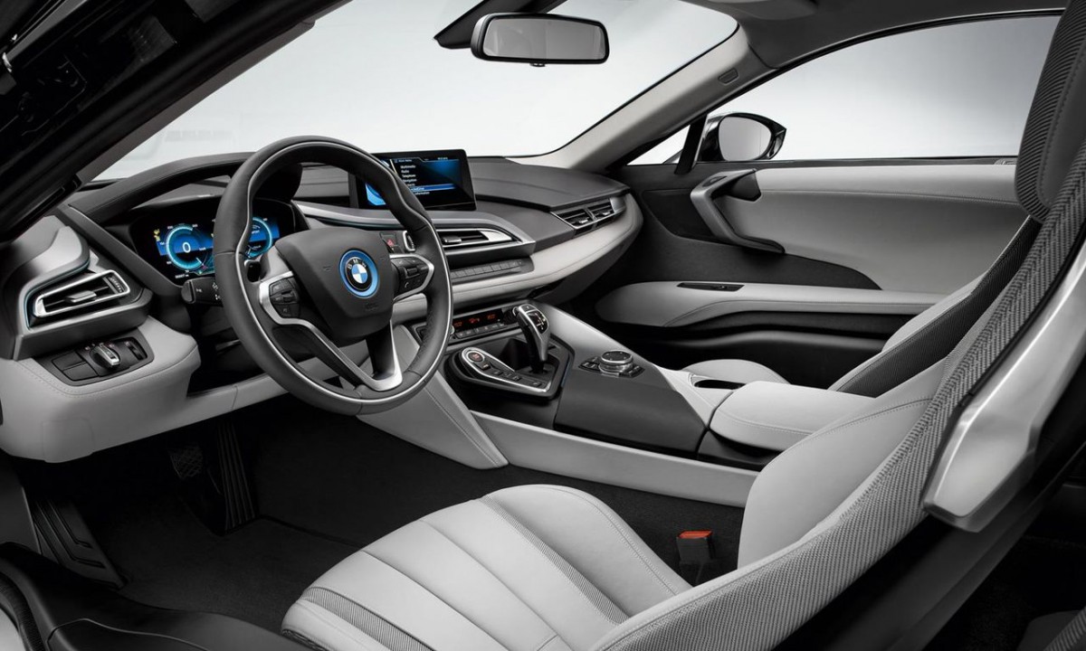Πίσω από τις ιδιαίτερες πόρτες του BMW i8 που ανοίγουν προς τα πάνω κρύβεται ένα ταμπλό που θυμίζει τις γραμμές των υπόλοιπων μοντέλων της φίρμας, αν και είναι αρκετά πιο φουτουριστικό.