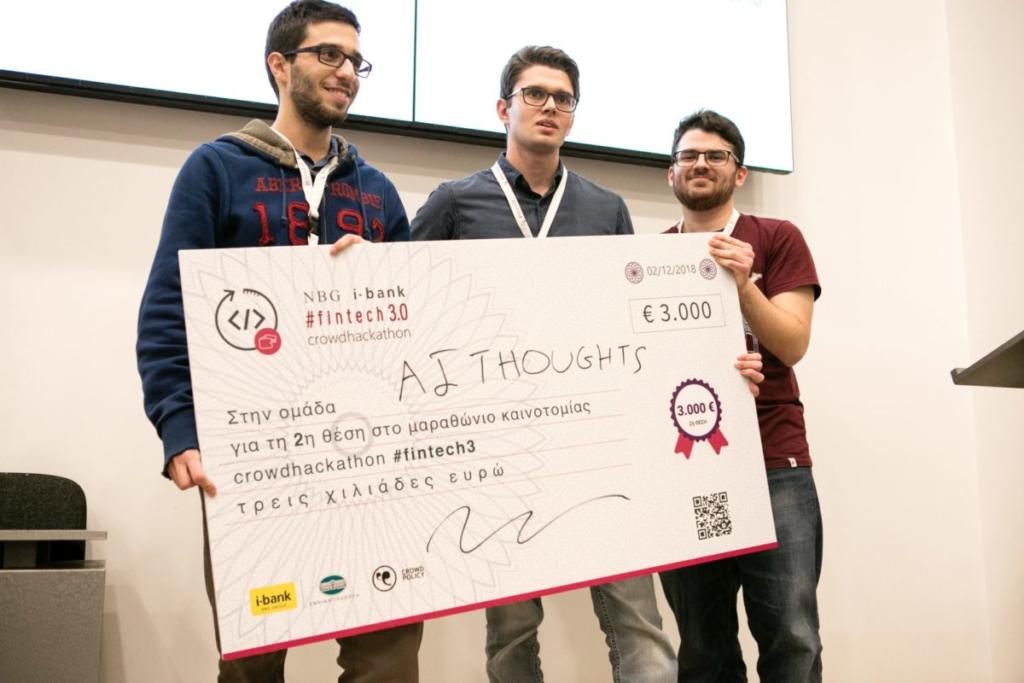 Το 2ο βραβείο και το χρηματικό έπαθλο των 3.000 ευρώ κέρδισε η ομάδα AITHOUGHTS. Η πιλοτική εφαρμογή της ομάδας είναι ένας ολοκληρωμένος αυτόματος ψηφιακός βοηθός (chatbot) που δέχεται εντολές από το χρήστη μέσω κειμένου (σύντομα μηνύματα από chat interface) και φωνητικών εντολών. H πλατφόρμα παρέχει τη δυνατότητα υλοποίησης συναλλαγών, καθώς αποθηκεύει με ασφάλεια στοιχεία του χρήστη με τα οποία μπορεί να πραγματοποιήσει τις συναλλαγές του.