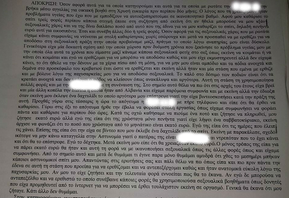 “Αφού καθάρισε το σπίτι τρεις φορές περίπου έπεσε κάποια στιγμή στη συζήτηση από εκείνη ότι αν ήθελα θα μπορούσε να μου κάνει σεξουαλικές χάρες και να της δίνω διπλάσιο ποσό από αυτό που της έδινα” ισχυρίζεται ο 52χρονος στο έγραφο που δημοσιεύει το bloko.gr
