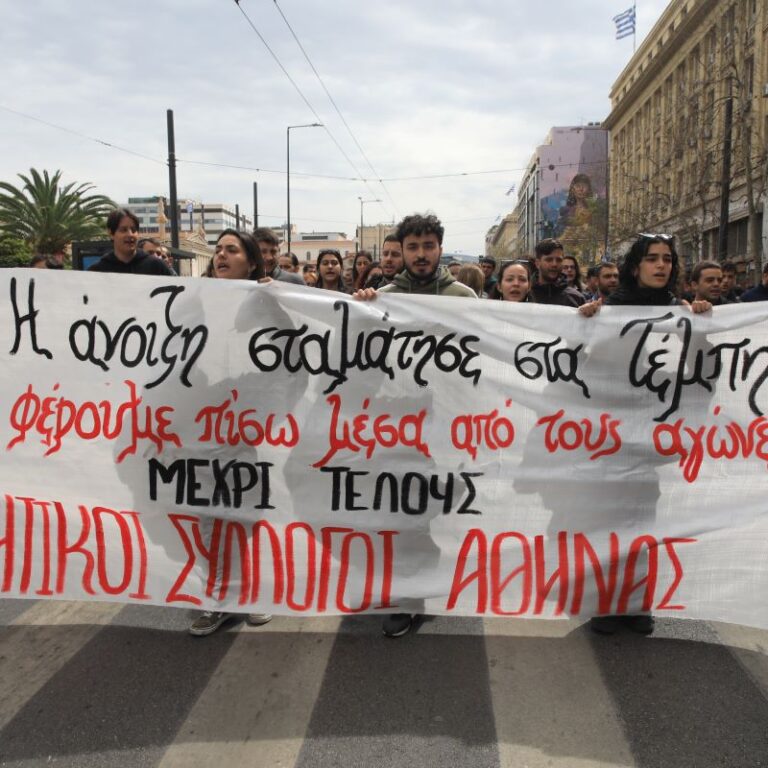 «Η άνοιξη σταμάτησε στα Τέμπη θα τη φέρουμε πίσω μέσα από τους αγώνες μας» έγραφε πανό που κρατούσαν φοιτητές με τη λήξη της στρατιωτικής παρέλασης το μεσημέρι της Τρίτης (25.3.25).