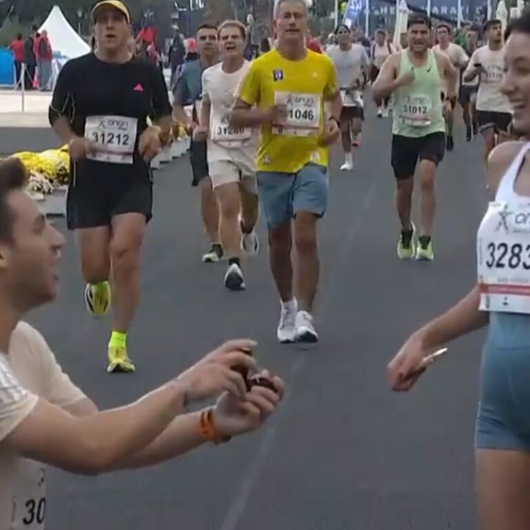 Ο ερωτευμένος νεαρός αποφάσισε να κάνει την πρόταση γάμου γονατίζοντας στην γραμμή τερματισμού των 10 χλμ του 42ου Αυθεντικού Μαραθώνιο Αθήνας, με την Τουρκάλα μαραθωνοδρόμο, την Νουρ Εϊγκούν -που μόλις είχε τελειώσει μετά από 48 λεπτά αγώνα- αρχικά να μένει έκπληκτη.