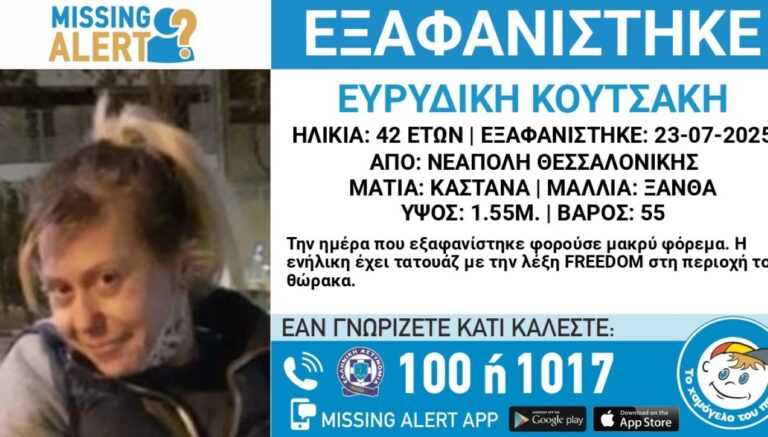 Πρόκειται για την Ευρυδίκη Κουτσάκη, 42 ετών, τα ίχνη της οποίας αγνοούνται από τις 23 Ιουλίου 2025, από τη Νεάπολη Θεσσαλονίκης.