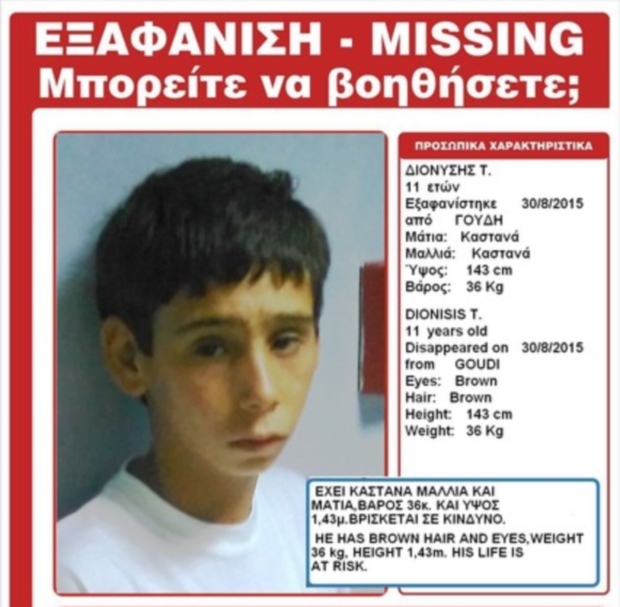 Στις 30 Αυγφούστου 2015 εξαφανίστηκε από το Γενικό Νοσοκομείο Παίδων Αθηνών «Η Αγία Σοφία», όπου νοσηλευόταν από τις 07/08/2015 για κοινωνικούς λόγους, ο Διονύσης Τ. 11 ετών.