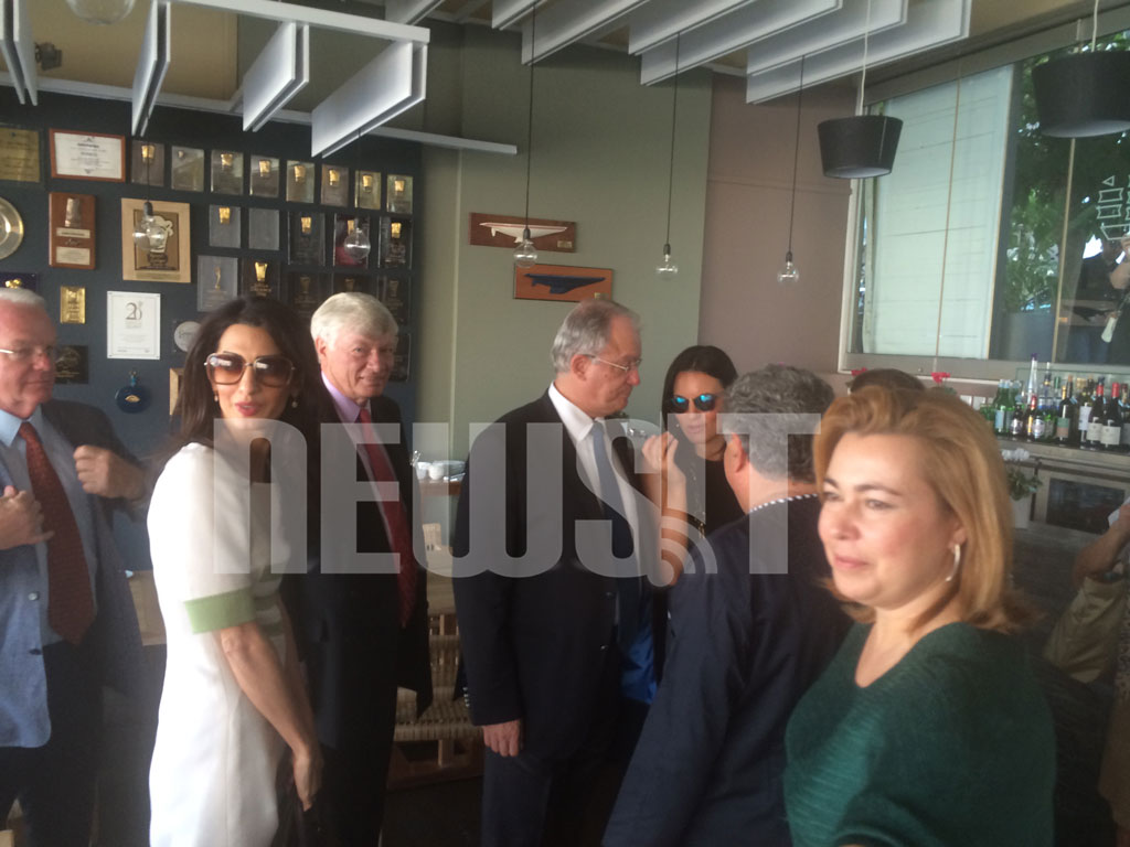 Όλα ήταν έτοιμα από νωρίς για το γεύμα της Αμάλ Αλαμουντίν και των συνεργατών της με τον υπουργό Πολιτισμού, Κώστα Τασούλα στο Μικρολίμανο, κάτω από τον λαμπερό ουρανό και με θέα τη θάλασσα. Στις 14:18 η κυρία Κλούνεϊ και οι συνεργάτες της έφτασαν στο εστιατόριο, όπου τους υποδέχτηκε η υπουργός Τουρισμού, Όλγα Κεφαλογιάννη αλλά και ο ιδιοκτήτης του εστιατορίου, Λευτέρης Λαζάρου.