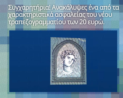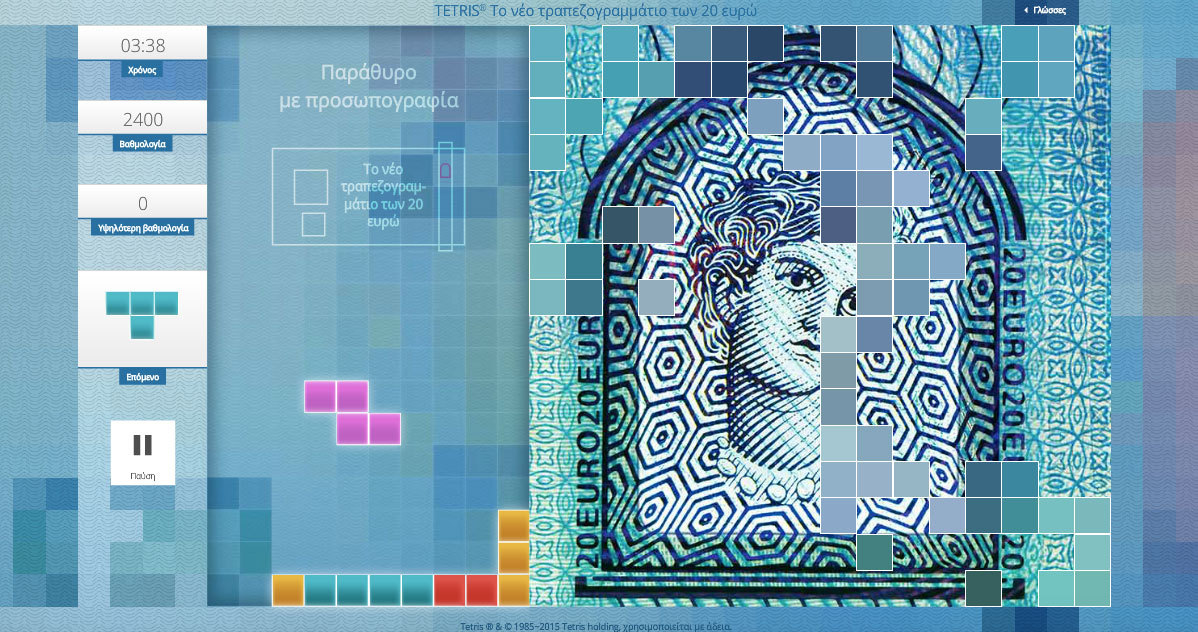 Είναι απόλυτα κυριολεκτικό! Παίζοντας κανείς online το παιχνίδι “Tetris® Το νέο τραπεζογραμμάτιο των 20 ευρώ” μπορεί να αποκαλύψει συγκεκριμένα από τα νέα χαρακτηριστικά του νέου χαρτονομίσματος.
