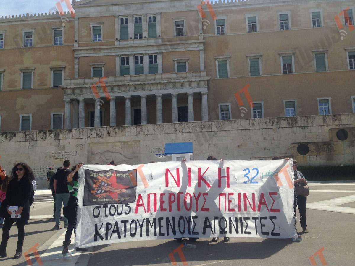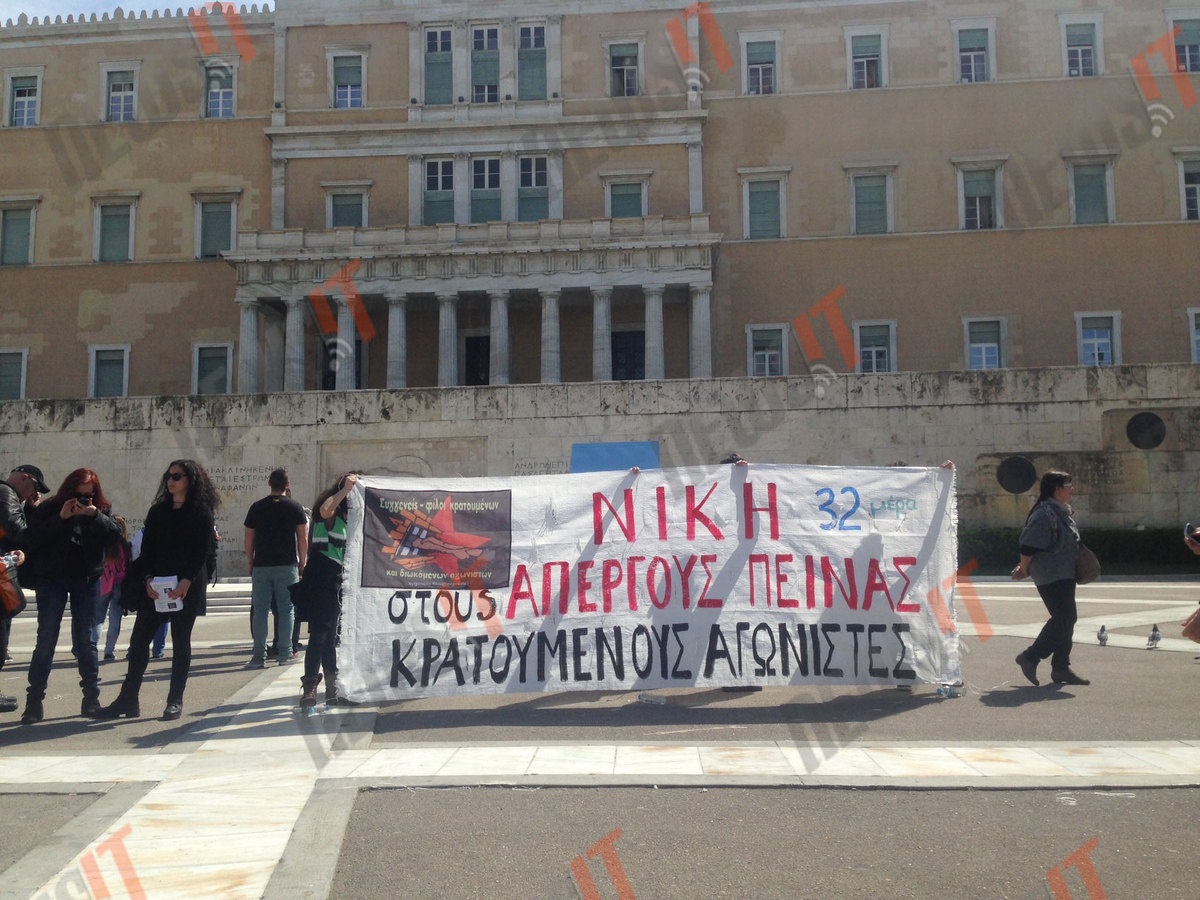 Συγγενείς και φίλοι των απεργών πείνας ανάρτησαν πανό στο μνημείο του Άγνωστου Στρατιώτη. Το πανό τους γράφει «Νίκη στους απεργούς πείνας κρατούμενους αγωνιστές».