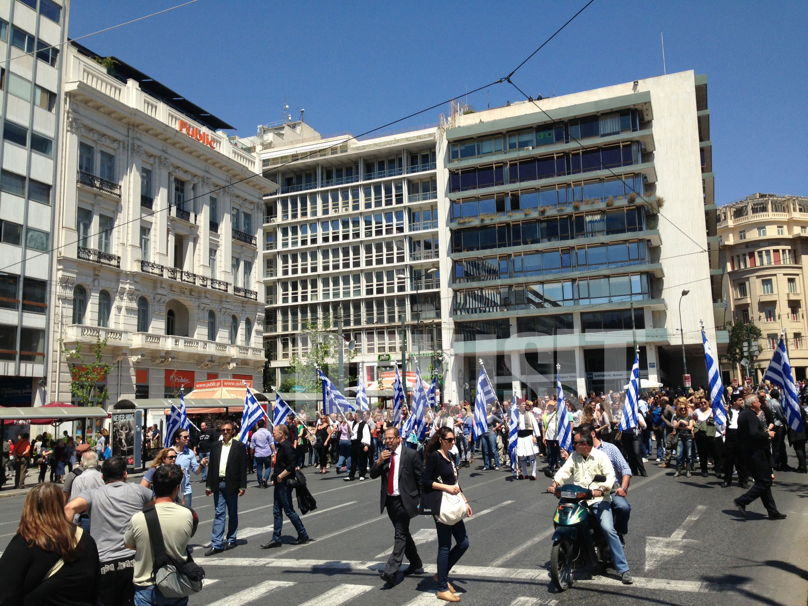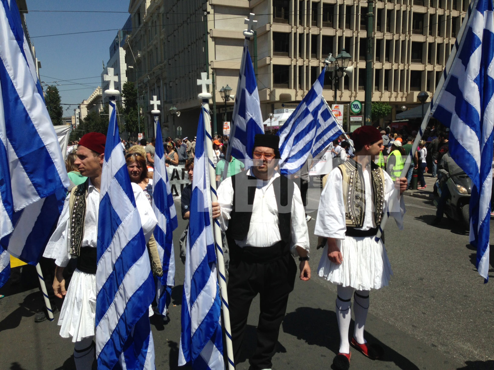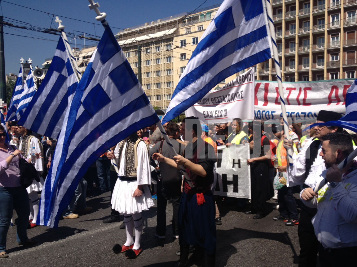Πολλοί από τους διαδηλωτές έχουν ντυθεί με παραδοσιακές φορεσιές και κρατούν ελληνικές σημαίες.