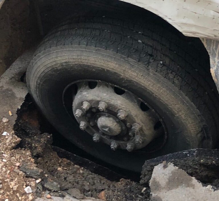 Απορριμματοφόρο παγιδεύτηκε σε μεγάλη λακκούβα στον Άγιο Δημήτριο