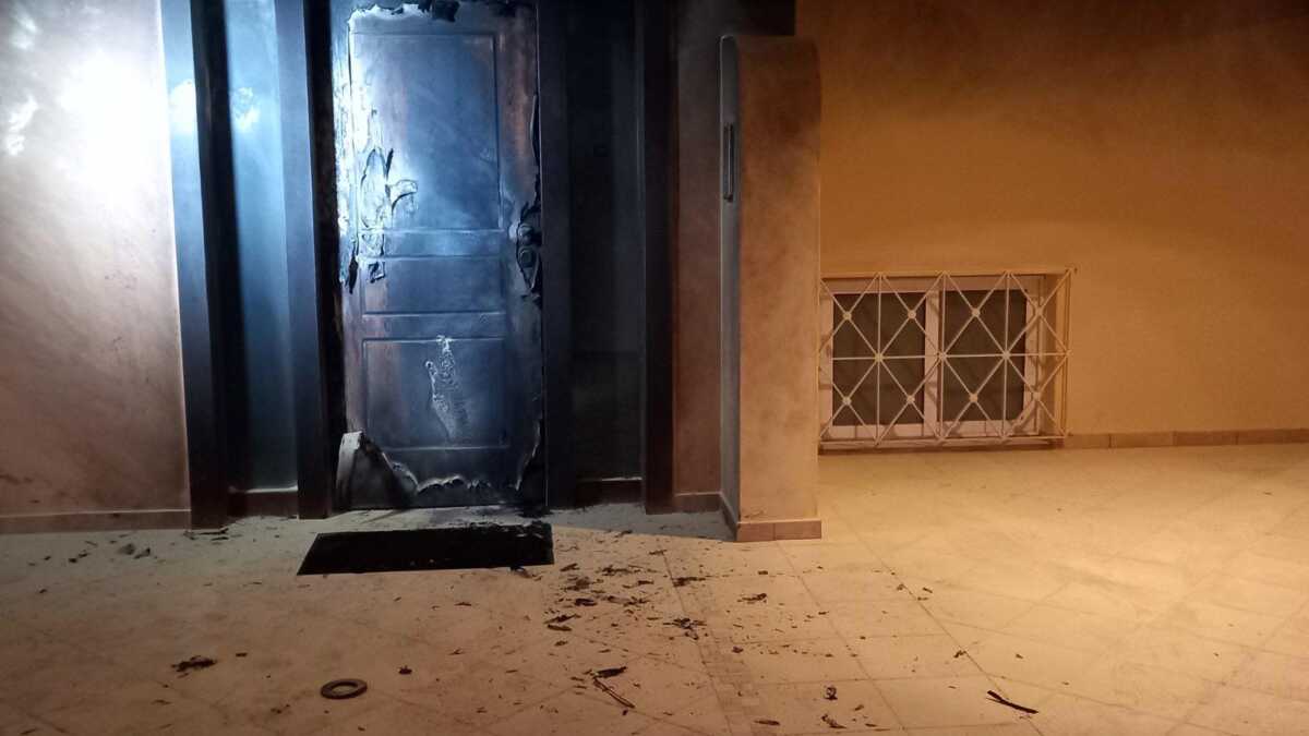 Η είσοδος της πολυκατοικίας έχει καταστραφεί ενώ τοίχοι έχουν μαυρίσει.