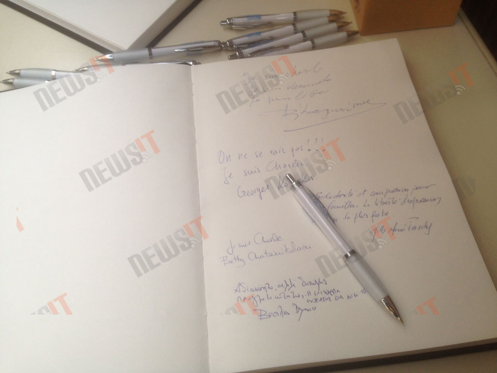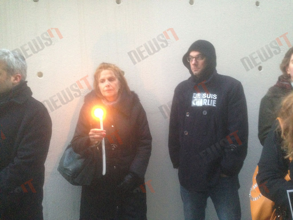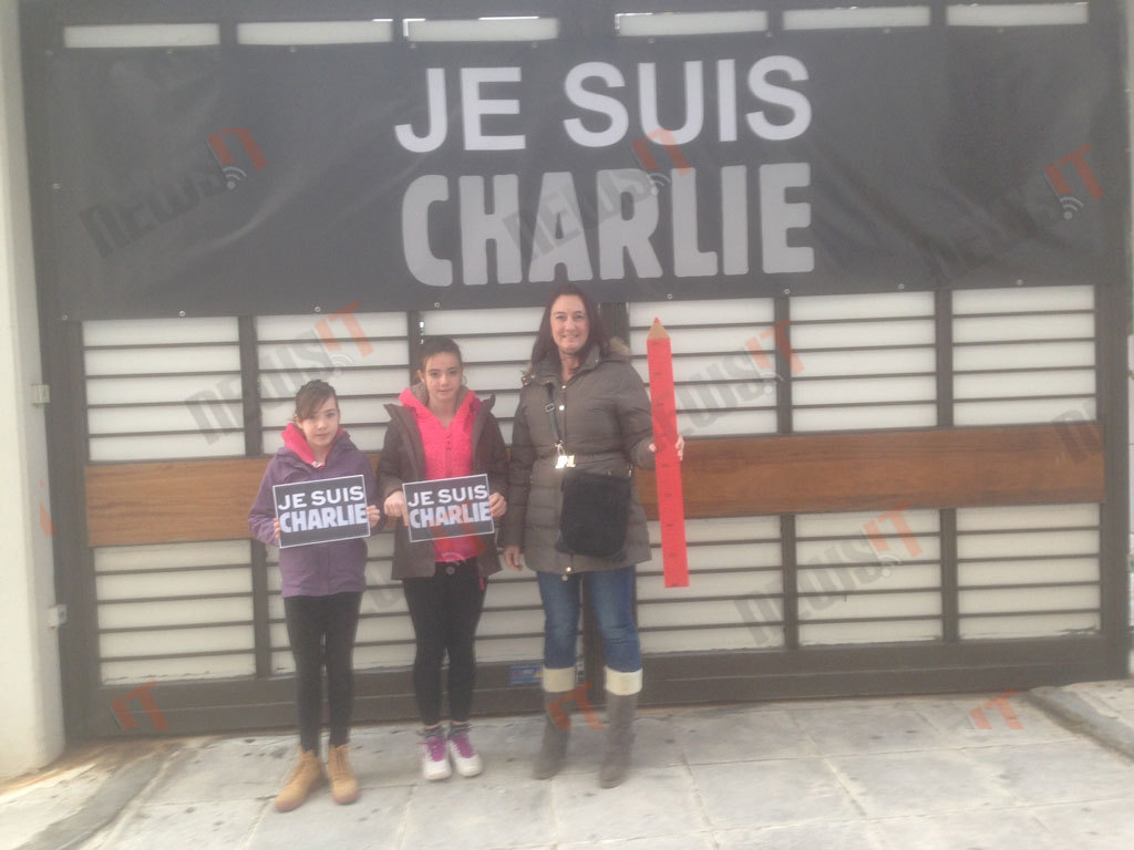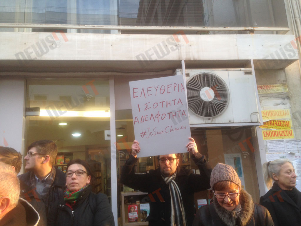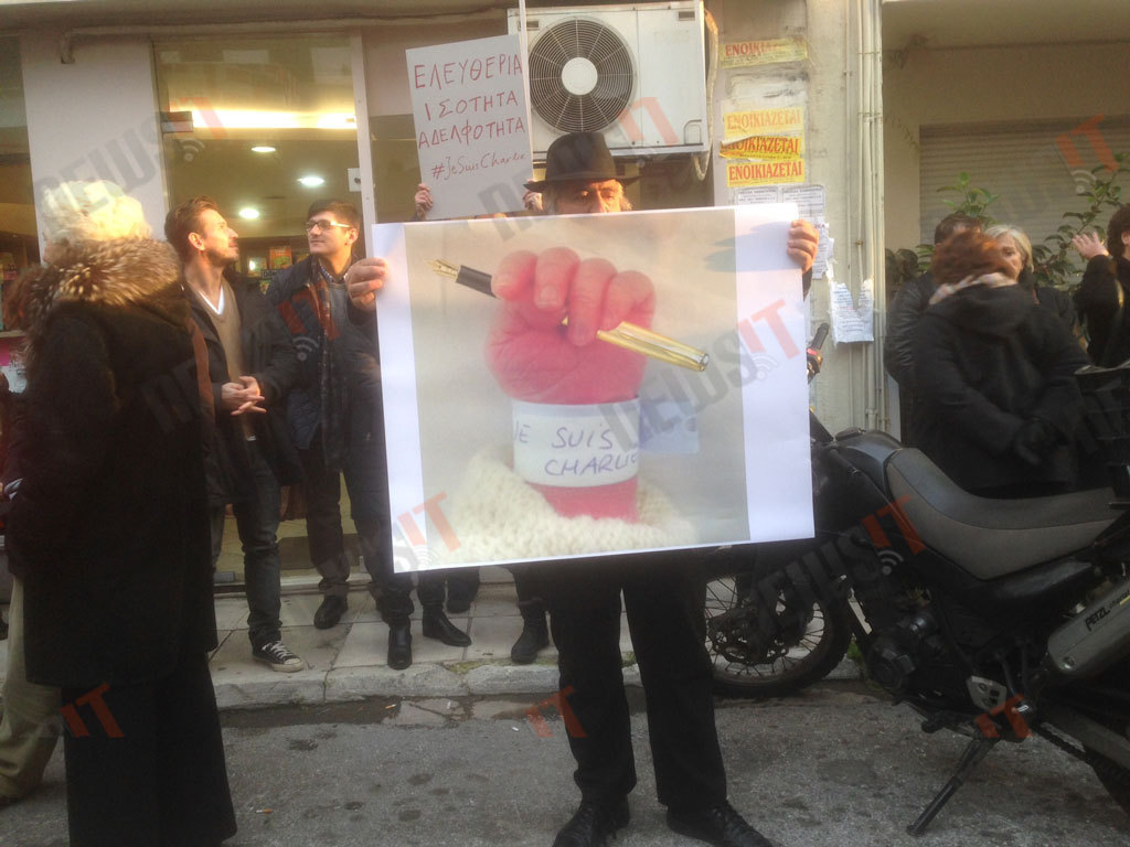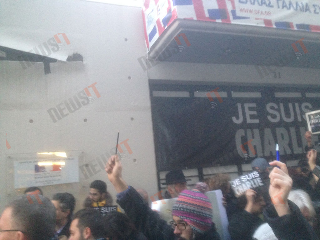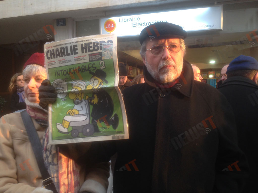 Κάποιοι κρατούν το τελευταίο τεύχος του περιοδικού Charlie Hebdo. Κάποιοι άλλοι ένα πλακάτ που γράφει το παγκόσμιο πλέον σύνθημα «Je suis Charlie».