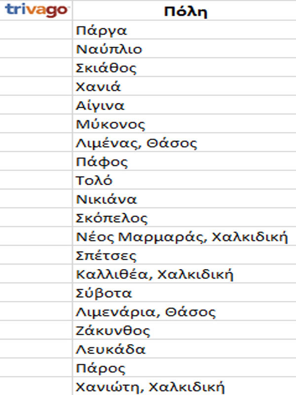 Σύμφωνα με την μηχανή αναζήτησης και σύγκρισης ξενοδοχειακών τιμών www.trivago.gr πρώτη είναι η Χαλκιδική που εκτόπισε την Πάργα που καταλάμβανε πέρυσι τη θέση αυτή, η οποία ωστόσο παραμένει μεταξύ των κορυφαίων προορισμών.