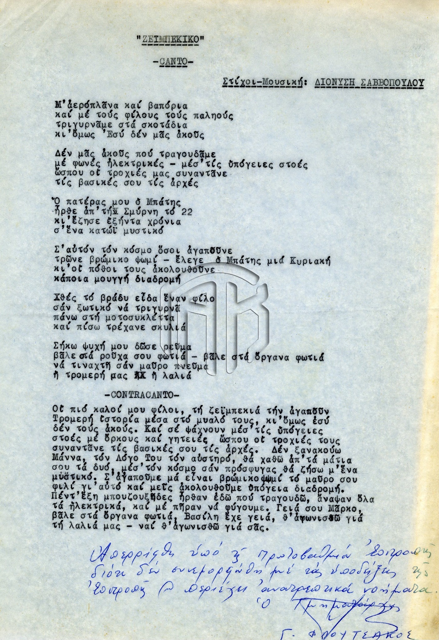 Τα τεκμήρια της ανάρτησης αφορούν τη λογοκρισία του εμβληματικού τραγουδιού του Σαββόπουλου “Ζεϊμπέκικο” από την επιτροπή λογοκρισίας της Γενικής Γραμματείας Τύπου και Πληροφοριών το αρχείο της οποίας βρίσκεται στην Κεντρική Υπηρεσία των ΓΑΚ», ανέφερε στο Facebook η επίσημη σελίδα των Γενικών Αρχείων του Κράτους.