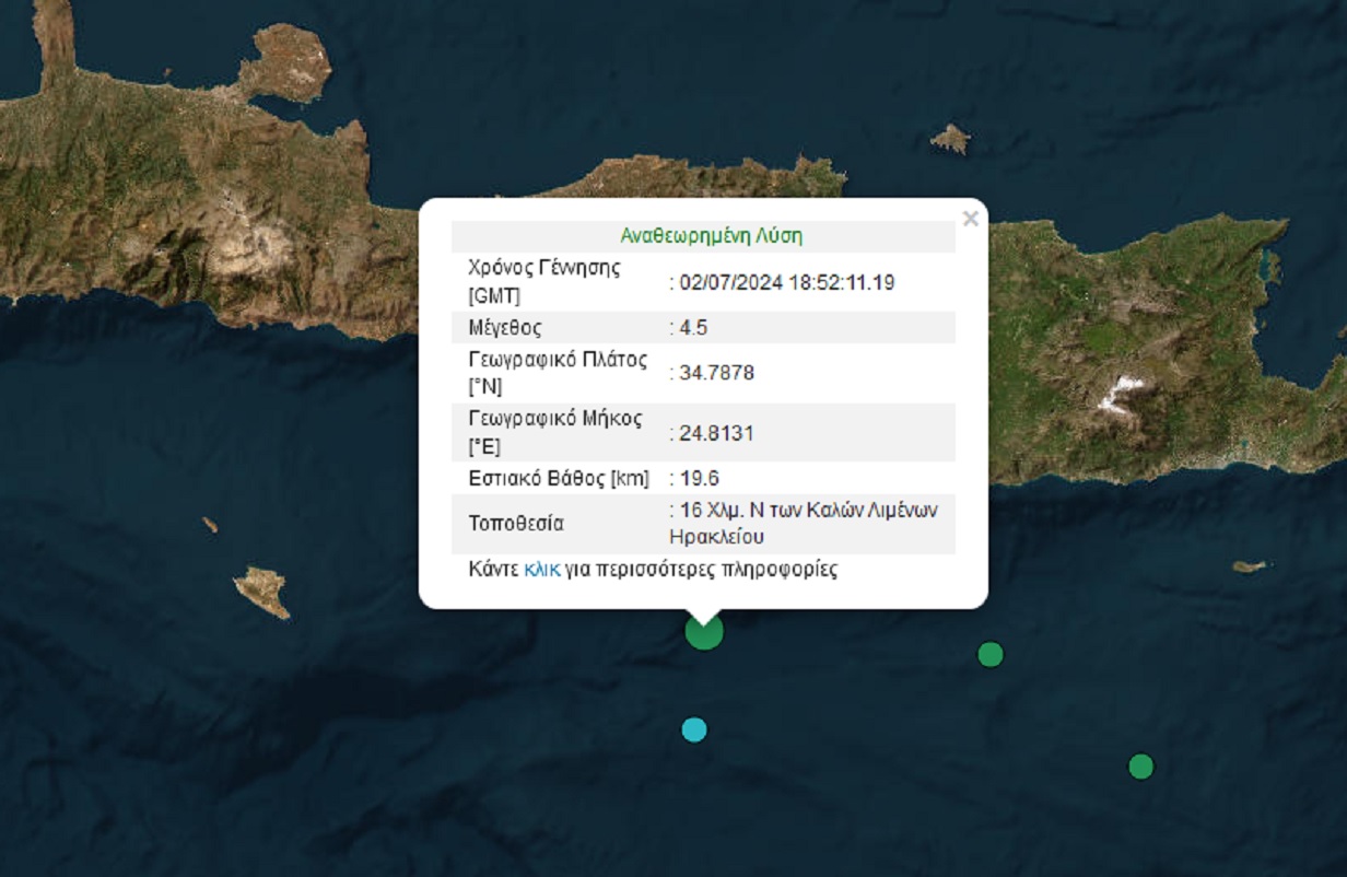 Ο πρώτος σεισμός στην Κρήτη σημειώθηκε λίγο πριν τις 10 το βράδυ της Τρίτης (02/07/2024) και είχε επίκεντρο τη θαλάσσια περιοχή των Καλών Λιμένων στο Ηράκλειο. Το εστιακό βάθος του σεισμού ήταν 19,6 χλμ.