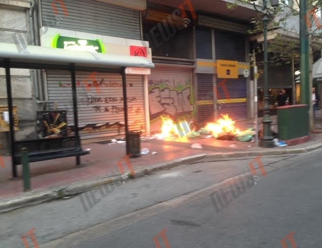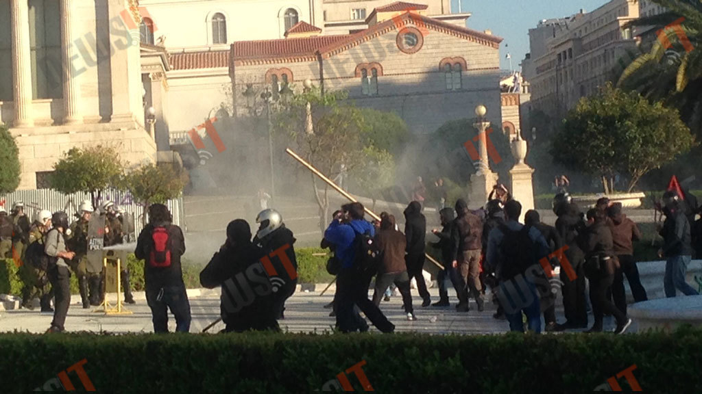Κάποιοι κουκουλοφόροι και κρανοφόροι προσπάθησαν να σπάσουν τον αστυνομικό κλοιό. Οι αστυνομικοί απάντησαν με ρίψεις χημικών και κρότου λάμψης και η κατάσταση πλέον έχει ξεφύγει εκτός ελέγχου.