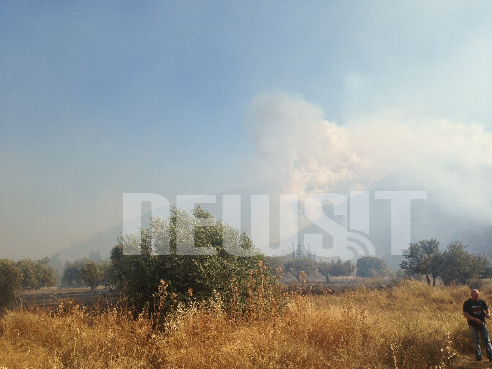 Η φωτιά αυτή την ώρα είναι σε ύφεση ενώ μάχη με τις φλόγες εξακολουθούν να δίνουν 100 πυροσβέστες με 55 οχήματα, 72 άτομα πεζοπόρο ενώ απο αέρος επιχειρούν 2 αεροσκάφη κι ένα ελικόπτερο.