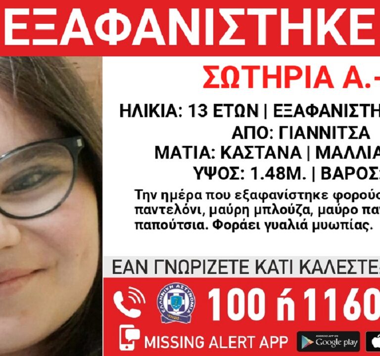 Συναγερμός έχει σημάνει στα Γιαννιτσά από την εξαφάνιση της 13χρονης Σωτηρίας όπως ανακοίνωσε το «Χαμόγελο του Παιδιού».