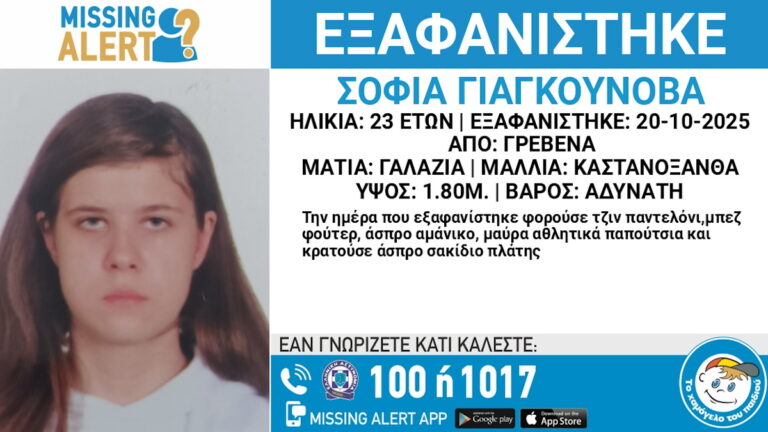 Το «Χαμόγελο του Παιδιού» εξέδωσε ανακοίνωση με την οποία ζητά πληροφορίες για την εξαφάνιση της 23χρονης Σοφίας Γιαγκούνοβα που χάθηκε στα Γρεβενά στις 20/10/25 το πρωί.